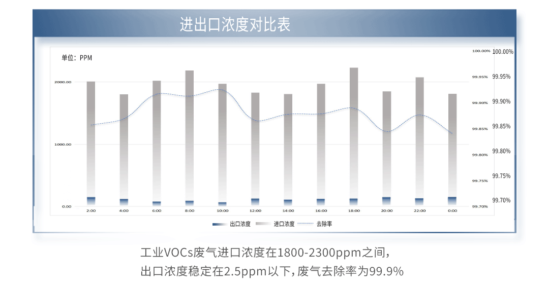 无碳排放。高效去除工业有机废气,尾排浓度<30mg/m³,并回收沸点在140℃以下难溶于水的VOCs